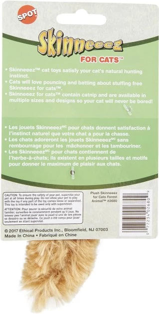 Stuffing free plush Skinneeez cat toys come in three realistic forest animal designs and contain catnip. Characters vary and ship at random.