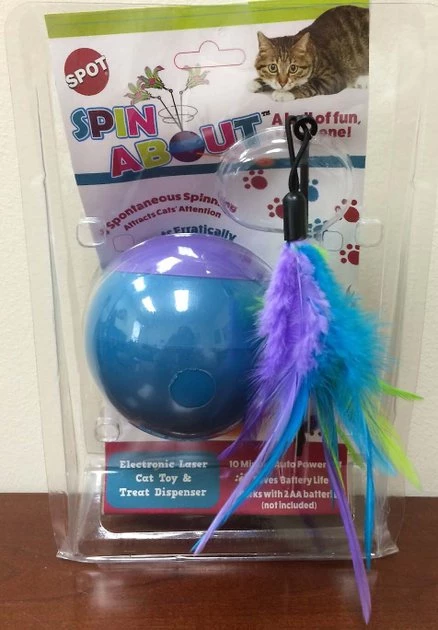 Your cat is going to have a ball with this Spin About cat toy. This ball is designed to hold and intermittently dispense your cat’s favorite treats. Simply put in 2 AA batteries (not included), fill the ball with tasty treats and turn the toy on. Your cat will be amazed and completely enthralled watching the feather wand spin spontaneously and the laser beam light up. Paw-sitively purr-fect for solo play, this thrilling cat toy, is sure to keep your kitty preoccupied. And to help preserve the battery life, it automatically shuts off after ten minutes of play.