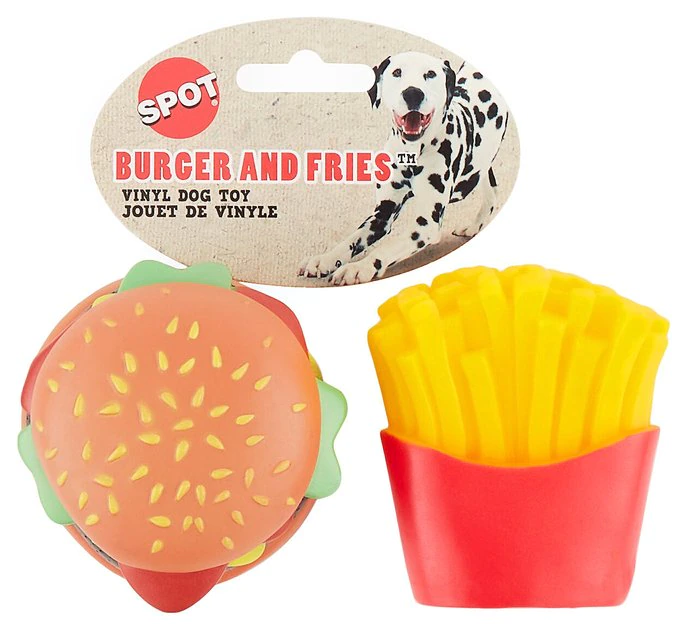 - The hamburger and fries measure 3-inches each, which means they are great for smaller dogs.