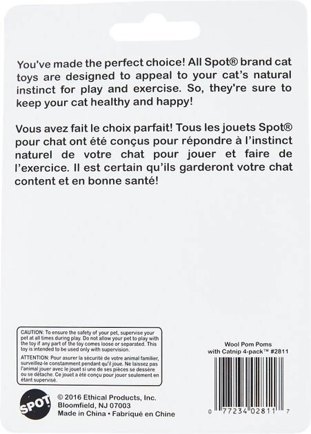 Ethical Pet Wool Pom Poms with Catnip Cat Toy are filled with 100% catnip will drive cats wild during playtime. Each pounce, bat or bite releases a strong aromatic fragrance sure to keep playtime super fun!